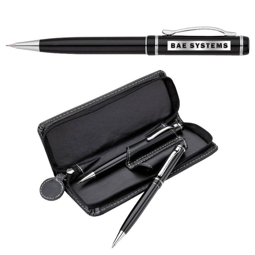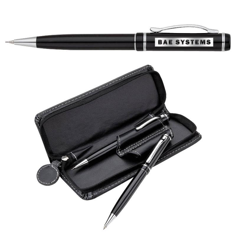 sku: 1213The set consists of a brass twist-action ballpoint and a twist-action pencil. They feature a satin finish and metal clip. Both come packaged in a leatherette case that has white contrast stitching and a zippered closure. The pen and the pencil are laser engraved in silver with the BAE Systems logo.