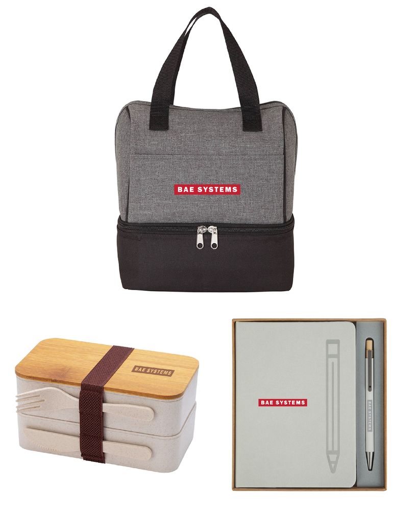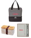 The New Hire Kit consists of the Canyons Lunch Sack / Cooler, the Savory Lunch Box Set, & the Manhattan II Gift Set w/ Magnetic Journal & Recycled Pen. All of the items are decorated as seen in the photo. Product Descriptions: The Canyons lunch sack and cooler is perfect for keeping your food, snacks and drink cool on a hot day. Made from durable 600D polyester with a two-tone grey denim finish on top and black base and trim. It features separate upper and lower insulated zippered compartments with PEVA lining and padded foam insulation. It also has a front pocket and carry handles. The Savory Lunch Box Set is a 2-compartment bento-style lunch box and cutlery set ideal for food storage or work lunches. Part of the Eco-Lifestyle Collection, the stackable containers, knife and fork are made from a blend of renewable wheat straw and BPA-free polypropylene. The top lid is made from bamboo and has a dual function as an eating surface or cutting board. Carry and store it bound together with its one-inch wide elastic closure. The Manhattan II Gift Set includes a soft-touch 5x7 Journal with 80 cream-colored lined pages and built-in bookmark, paired with a recycled aluminum pen featuring a bamboo plunger. In between note-taking, the pen stays in place by setting it on the magnetic outline of the pen on the journal cover. Presented in a brown gift box with a die-cut foam tray for a stylish and secure packaging, and combining functionality with eco-friendly materials, this set is an ideal choice for thoughtful gifting to both business associates and new hires.